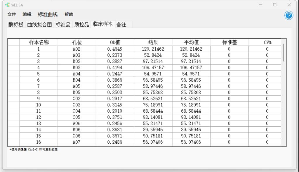 5.點(diǎn)擊‘臨床樣本’得到最終數(shù)據(jù)??芍苯訌?fù)制結(jié)果到EXCEL文檔里保存。