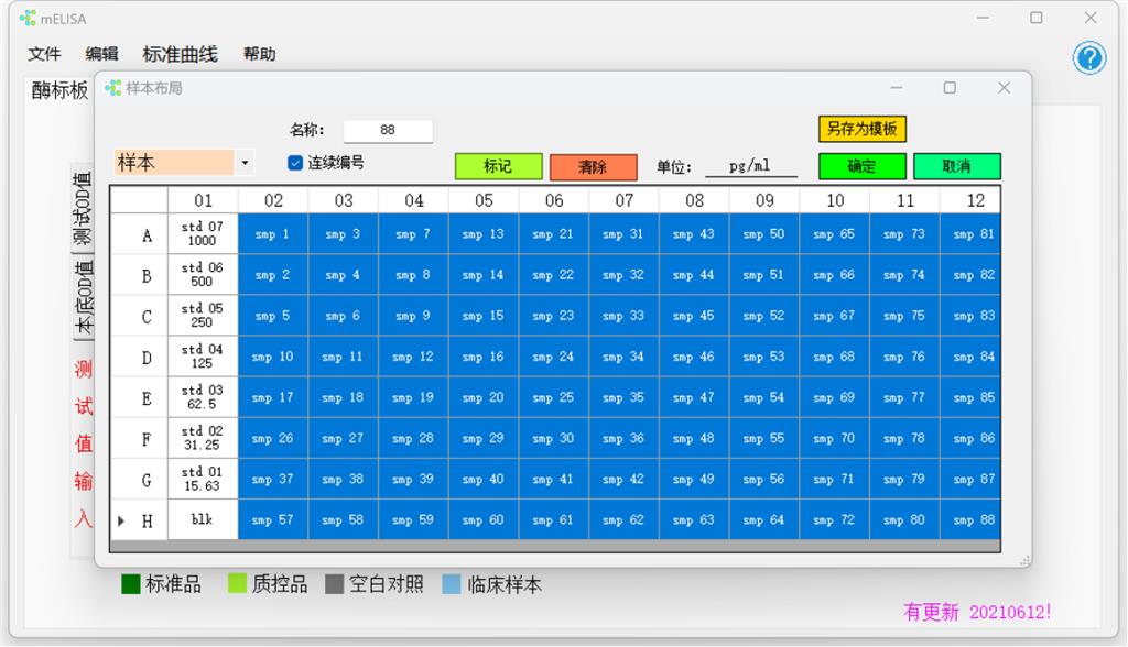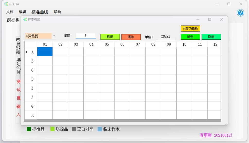 2.設(shè)置好標(biāo)準(zhǔn)品、空白對照、樣本孔,有質(zhì)控品設(shè)置質(zhì)控品孔(設(shè)置時可直接拉取設(shè)置孔位子,設(shè)置好點(diǎn)‘標(biāo)記’,填寫好溶度和單位。)。 (如下圖以人il-6試劑盒為例。)